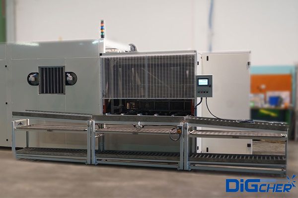 PT-6 SSDA 大軸承通過式清洗線采用動力(lì)輥子輸送上料,網帶帶動工件一次進入噴淋清洗工位、噴淋漂洗工(gōng)位(wèi)、烘幹(gàn)工位及(jí)霧化上油工位。采用知名(míng)品牌PLC實現清洗過程全(quán)自動準確控製,可變頻調速(sù)。