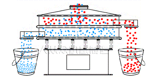 旋振篩采用立(lì)式電機作激振源,工作時通過偏心重錘將電機(jī)的旋轉(zhuǎn)運動轉變為水平、垂直、傾斜的三(sān)次元(yuán)運動,這個運動力傳到(dào)篩麵(miàn),從(cóng)而使篩麵上的物料一起運動,伴隨著篩網(wǎng)的運動,小於篩麵孔徑的物料通過篩孔落到下層,大於篩麵孔徑的物料從排料口(kǒu)排出,完成篩分(fèn)工作。可(kě)以通過調整偏心塊的位置,來改變物料的運動軌跡,從而適應不同的篩分目的。