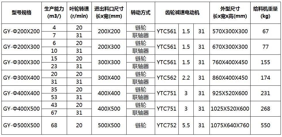 GY剛(gāng)性葉輪給料機技術(shù)參數(shù):