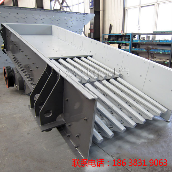 振動給料機由振動電機、給料槽、彈簧支(zhī)座和(hé)傳動裝置等部件組成。振動給料機的動力(lì)來源是振動電機,工作時,振(zhèn)動電機的偏心塊旋轉產生(shēng)激振(zhèn)力,帶動給(gěi)料(liào)槽振動,使物料沿著類似圓形(xíng)的軌跡做跳躍運動,物(wù)料連續不斷運動,達到(dào)輸(shū)送物料的目的。在砂石生產線中經常使用的兩種振(zhèn)動給料機結構(gòu)是鋼板結(jié)構和篦條結構,鋼板結(jié)構(gòu)的振(zhèn)動給料機可以將物料均勻穩定的送入破碎設備中,篦條結構的振(zhèn)動給料機不但能輸(shū)送物料,還可以在輸送過程中對物料進行粗篩分,配置(zhì)在製砂係統中更經濟(jì)合理(lǐ)。振動給料機調節性能(néng)好,可以達到不同物料的給料需(xū)求(qiú)。